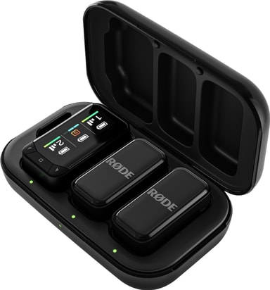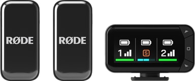 RØDE Micro Camera trådløst lavaliermikrofonsett har to kompakte sendere med innebygde mikrofoner, kameramottaker med 1,1" AMOLED-skjerm, en USB-C-mottaker, Intelligent GainAssist, ladedeksel, og universell tilkobling for telefon og kamera.Les mer om produktet