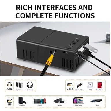 Allsidig tilkobling: Denne projektoren er utstyrt med flere tilkoblingsalternativer, inkludert HDMI, USB, TF og AV-porter, og tilbyr sømløs kompatibilitet med et bredt spekter av enheter. Koble enkelt til smarttelefonen, nettbrettet, spillkonsollen eller bærbar PC for en problemfri multimediaopplevelse.