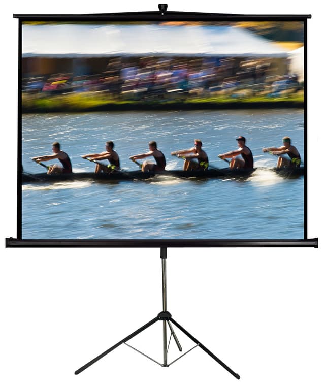 Projektorskjerm 112"" på stativ Se storformatfilmer på en profesjonell projektorskjerm. Høydejusterbart stativ med lås. Svarte kanter på alle 4 sider av lerretet. Slitesterk lerret i matt hvit. Svart-støttet skjermmateriale. Enkel å rengjøre. Bred visningsvinkel på 160° Høyde på fot: 55 cm Høyde for lerret 100cm Høyde til topp 293cm