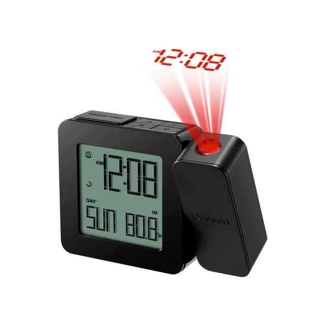 En enkel, men moderne design, denne radiostyrte, er både lett å lese og betjene. Lcd-skjermen viser gjeldende tid, dag, innendørs, utetemperatur og vær i steller skrift som gir et raskt blikk på tiden. Alltid nøyaktig tid! Lett å se projeksjonen, hvellerfeller fumler i mørket eller må bytte lys bare feller å se tiden. Aldri må sette tiden igjen med denne radiostyrte vekkerklokken. Den stellere lcd-skjermen viser gjeldende tid, dag og alarmstatus. Med et enkelt trykk på den øverste snooze-knappen feller å aktivere det svarte lyset gjør det enkelt å se på om natten.
