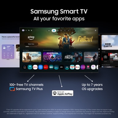 Opplev et mer intelligent og integrert system med Tizen og ha all underholdningen din på ett sted. Tizen er designet for å gi deg enkel tilgang til favorittinnholdet ditt så snart Samsung Smart TV-en din slås på. Få tilgang til favorittfilmene, seriene, sosiale medier, eller last ned og utforsk nye og spennende apper.