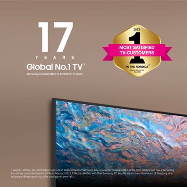 1 Kilde – Omdia, januar 2023. Resultatene er ikke ment som en anbefaling av Samsung. Tillit til resultatene skjer på tredjeparts eget ansvar. 2 Ifølge en spørreundersøkelse gjennomført av Kantar Sifo i januar 2023 er 93 % av de spurte fornøyde med sin Samsung-TV. Resultatene er ikke ment som en anbefaling av Samsung. Tillit til resultatene skjer på tredjeparts eget ansvar.3 Gjelder ved kjøp av utvalgte projektormodeller og utvalgte 2023-modeller av Samsung-TV på samsung.com og hos utvalgte forhandlere i perioden 20.04–31.12.2023. Underlagt begresninger, og strømmetjenestetilbudene som er inkludert, kan variere under kampanjen. Krever at kunden oppretter konto hos den aktuelle strømmetjenesten. Samsung kan vise reklame og kampanjer på Smart TV-grensesnittet og i applikasjoner. Tilgjengeligheten av apper kan variere over tid og avhengig av region. Vilkår: samsung.com/no/tvs/smart-tv/smart-start. 4 Garantien gjelder i 10 år fra kjøpsdato. Krever en kopi av kjøpskvittering og registrering på Samsungs nettsted innen 90 dager etter kjøp. Gjelder for kjøp av utvalgte 2023 TV-modeller mellom 20.04.2023 og 31.03.2024. Se vilkår på: samsung.com/no/offer/offline/screen-burn-warranty