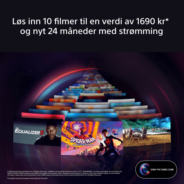 Du kan løse inn 10 filmer i SONY PICTURES CORE-appen5, med 24 måneders strømming. Fra IMAX® Enhanced til Dolby Atmos®6-titler, det finnes ingen bedre måte å se hvor utrolige filmer er enn på BRAVIA 9!