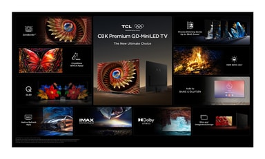 TCL C8K-serien kombinerer ZeroBorder*, QD-Mini LED, QLED, 4K HDR Premium 5000**, CrystGlow WHVA Panel, 144Hz Motion Clarity Pro for kraftig presise kontraster, lavreflektivitet, skarp og fargerik HDR-bildekvalitet med ultrabred fargevisningsvinkel.Les mer om produktet