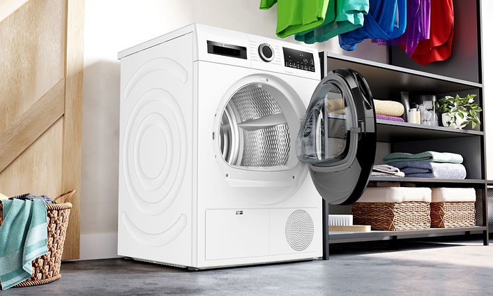 Det kan være vanskelig å velge riktig tørkeprogram for tøyet ditt. Smart Dry gjør jobben for deg. Bruk Home-Connect-appen for enkel kontroll, eller koble til vaskemaskinen og tørketrommelen via Wi-Fi, så velges riktig tørkeprogram automatisk basert på innstillingen vaskemaskinen din hadde.