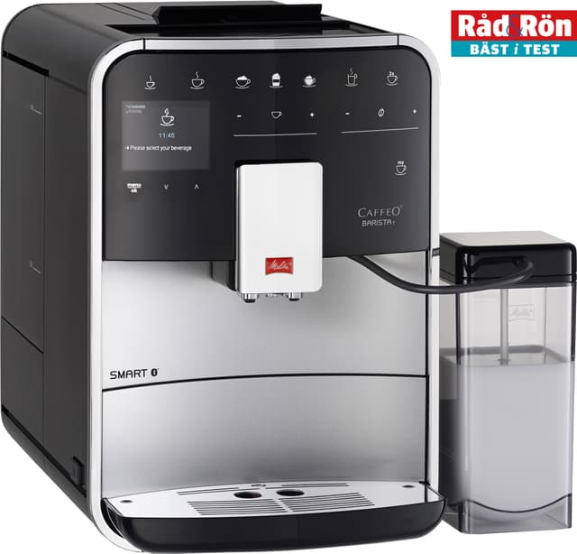 Melitta kaffemaskin, kaffebønner, kaffekvern og melkeskummer og espressomaskin mellom et parMelitta kaffemaskin, kaffebønner, kaffekvern og melkeskummer og espressomaskin mellom et par