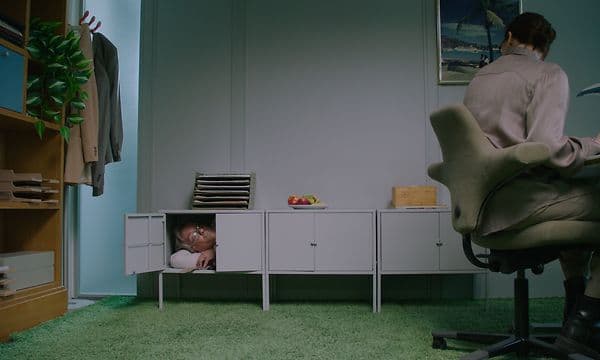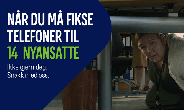 Kampanjebanner med kvinne som gjemmer seg under bordet og reklametekst for Elkjøp bedrift
