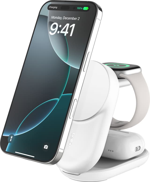 Belkin 3-in-1 Qi2 sammenleggbar lader med MagSafe (hvit)
