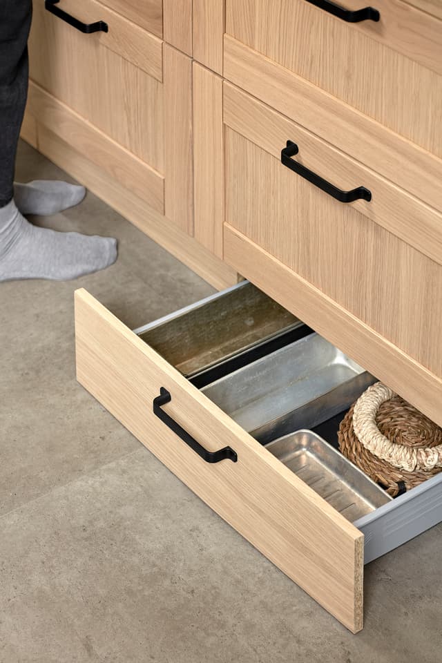 Utnytt oppbevaringsplassen under underskap. Passer skap som er 60 cm brede. Skuffesider i pulverlakkert stål. Skuffebunn og bakstykke i melamimbelagt sponplate. Skuffen bruker rullekspansjoner for enkel og smidig åpning og lukking. Avstand mellom benene må være 51 cm ved montering.Inkludert i pakken er 2 stk hvite, grå og sorte kantbånd for å dekke kantene der sokkelen ble kuttet for å lage fronten.