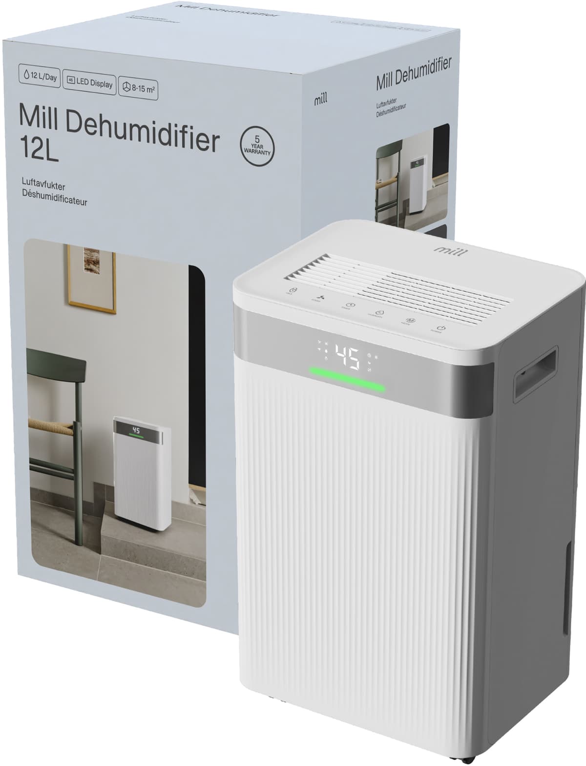 Mill luftavfukter MDH12 passer til rom på 8-15 m² og er ideell for tørking av klær i kjelleren. Den har en 2-liters vanntank, to viftehastigheter, tre moduser (tørr, auto, hvilemodus), LED-display, tidsur og barnesikring for enkel og sikker bruk.Les mer om produktet