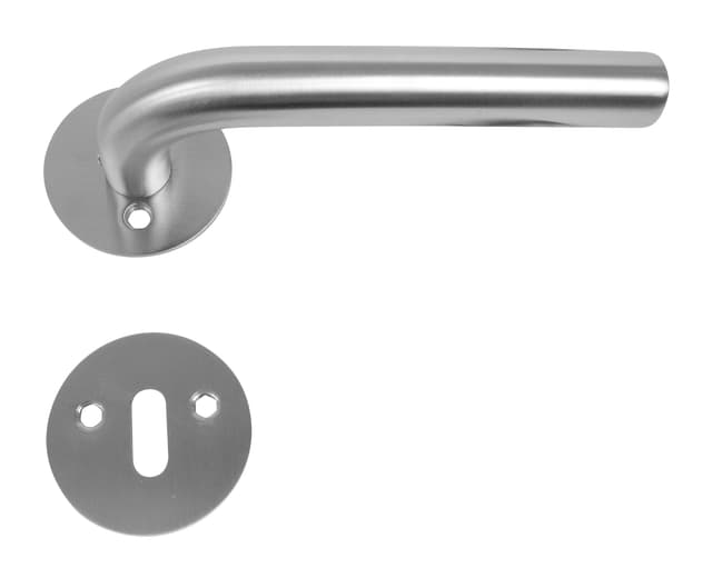 Dørhåndtak DESIGN i rustfritt stål med fast rosett L-håndtak design Ø19 mm Kvalitet: 201 stål Flott finish med meget tynn rosett som gjør håndtaket ekslusivt Inkl. 2 stk. nøkkelskilt og komplett universelt monteringssett til nye og eldre dører