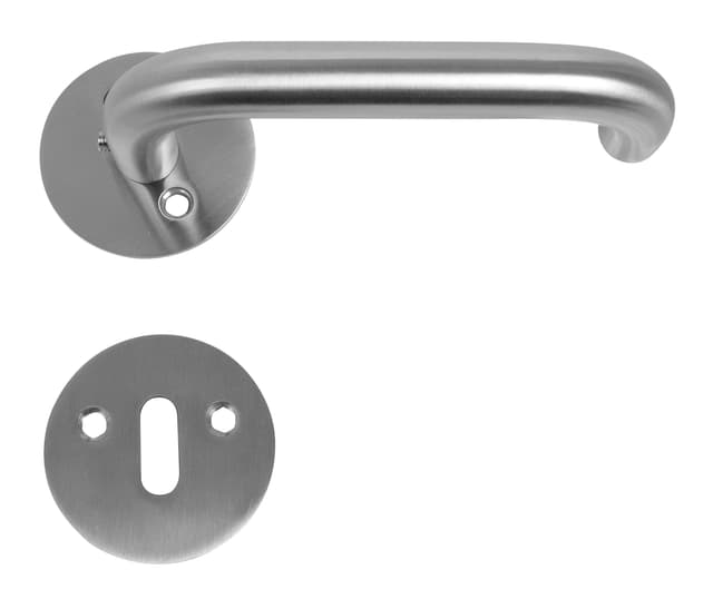 Med klickrosett U-handtag design Ø16 mm Kvalitet: 201 stål Snygg finish med mycket tunn rosett som gör handtaget exklusivt Inkl. 2 st. nyckelskyltar och komplett universalmonteringssats för nya och äldre dörrar