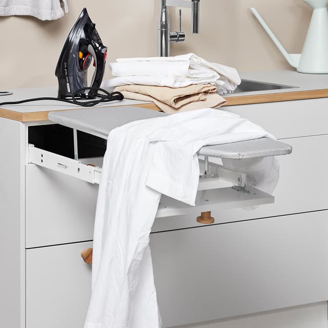 Med et integrert strykebrett kan du stryke plagg på en enkel og komfortabel måte, uten at strykebrettet tar opp for mye plass. Strykebretter kan stilles inn for å passe skuffestørrelser på mellom 40-50 cm. Den perforerte bunnen slipper gjennom damp. Kan reguleres for forskjellig overheng av benkeplate. Glidesjikt i skinnen og automatisk lås gir komfortabel bruk. En skuffefront på 40x13 eller 50x13 cm monteres i bredden for et helhetlig inntrykk.