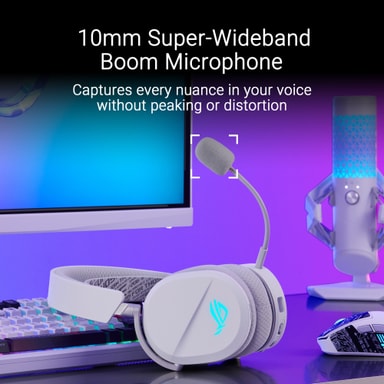 Hev spillopplevelsen din med ASUS ROG Pelta Wireless gamingheadset. Med 50 mm titanelementer og 10 mm wideband-mikrofon gir det deg oppslukende, flott lyd. Med Bluetooth- og USB-C-tilkobling gir det sømløs trådløs ytelse.Les mer om produktet