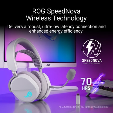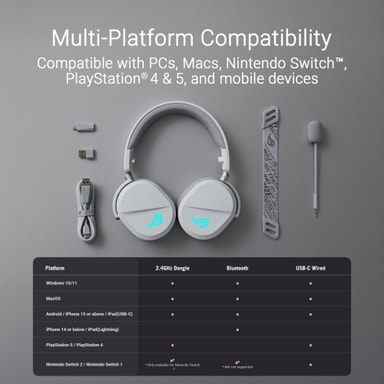 Bytt mellom modusene for å få den perfekte balansen mellom ytelse og fleksibilitet, takket være denne hodetelefonens trippelmodustilkobling. Dette headsettet tilbyr allsidig tilkobling med Bluetooth for trådløs bekvemmelighet, 2,4 GHz med ultralav latenstid ved hjelp av ROG SpeedNova-teknologi for spill uten forsinkelser og en kablet USB-C-tilkobling for stabil lyd av høy kvalitet.