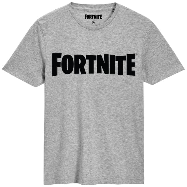 Grey T-shirt with Fortnite logo on the front. Size L, equivalent to the European size 52.