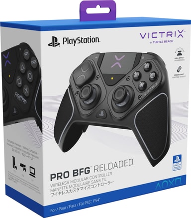 Turtle Beach Victrix Pro BFG Reloaded PS5 kontroller har modularitet med utskiftbare stikker og en 6-knappers fightpad. Den inkluderer Hall Effect anti-drift-teknologi, 5-trinns clutch-triggere og 4 programmerbare bakknapper. Med 20 timers batteri og Sony 3D Audio er den bygget for PS5-, PS4- og PC-profesjonelle.