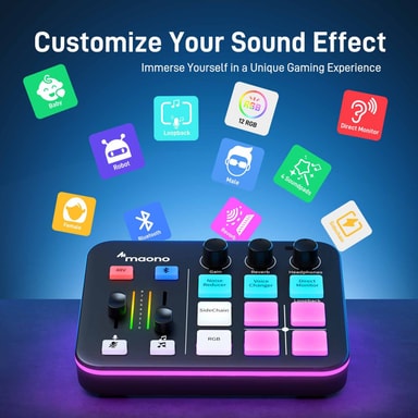 Maono G1 NEO har 4 tilpassbare lydputer som lar deg legge til effekter, jingler eller samples for å gjøre opptakene og strømmene dine mer morsomme og engasjerende.