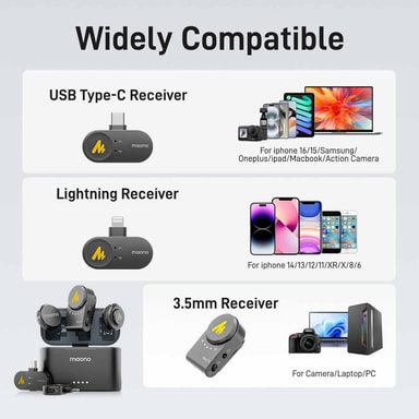 Maono PA3 tilbyr enkelt plug-and-play-opptak med sin Lightning-mottaker og støtter også stabil Bluetooth-tilkobling, noe som gir deg fleksible måter å koble til og starte opptak med en gang.