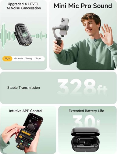 Maono PBC2 mini trådløs mikrofon er en liten trådløs mikrofon som leverer klar 48kHz/16bit lyd i studiokvalitet. Den har 4-trinns KI-støyreduksjon, lang batteritid på opptil 30 timer, og fungerer enkelt med telefoner, nettbrett og PC-er via Lightning eller USB-C, noe som gjør den perfekt for vlogging, strømming og opptak på farten.