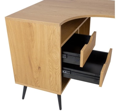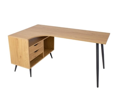 Skrivebord GEORGIA 145x80xH75cm, melamin med eikedekor. Bordet er laget av melaminbelagt møbelplate. Bordbena er laget av metall og ferdig med svart pulverlakk. Under bordplaten er det to skuffer og tre åpne hyller i forskjellige størrelser.Les mer om produktet
