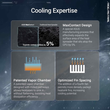 ROG Astral oppgraderer kjølingen med et fireveiftsoppsett som øker lufttrykket med 20 %. Det har et patentert dampkammer med fresekanaler for å forbedre varmeoverføringen med 10 %, pluss en faseendrende termisk pute som smelter under belastning for å sikre at GPUen holder seg optimalt kjølig.