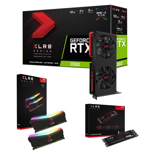 The package includes PNY GeForce RTX3060 Revel Dual Fan 12GB (VCG306012DFXPPB), XLR8 Gaming EPIC-X RGB DDR4 3600MHz - 16GB (2x8GB) (MD16GK2D4360018XRGB) and the PNY XLR8 CS3040 Gen4 M.2 NVMe SSD 1TB (M280CS3040-1TB-RB)Les mer om produktet