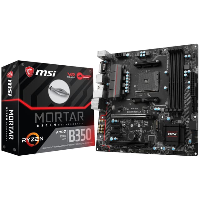 MSI B350M Mortar motherboard lets you fit poweful components into a compact chassis. This Micro ATX-format motherboard has AM4 socket for AMD Ryzen or 7th gen. A-series and Athlon processors, support for dual AMD CrossFire GPU and red LED lighting. You can install up to 64 GB fast DDR4 RAM as well as enhance the responsiveness of your setup with super fast M2.SSD storage. Expansive wired connectivity lets you hook up a 4K UHD monitor, 7.1 HD audio setup or speedy USB 3.1 devices.