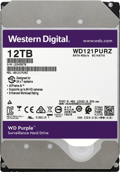 WD Purple Surveillance 3,5" intern harddisk er designet for kontinuerlig drift og innspilling av opptak fra overvåkningskameraer. Harddisken har en kapasitet på 12 TB og kobles til via SATA-600-grensesnitt. Harddisken er videre spesialtilpasset bruk med opptil 64 overvåkningskameraer og kan brukes i NAS-løsninger med plass til opptil åtte harddisker.