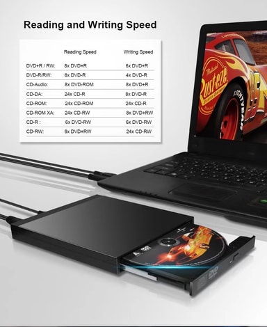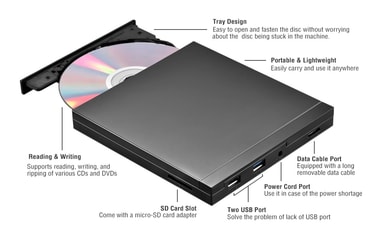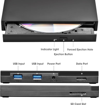 NÖRDIC bærbar CD-brenner og spiller koblet til datamaskinen din med USB-A eller USB-C lar deg både lese og brenne CD- og DVD-plater. Enheten fungerer også som en USB-hub med 2x USB-A-porter, 1x SD og 1x micro-SD-spor. Produktet støtter CD±R/RW, CD-ROM, DVD±R/RW, DVD-RAM, VCD og SVCD og er kompatibelt med Windows, Linux og MacOS (ikke kompatibelt med Chromebook, nettbrett, TV eller mobil). Maksimal skivestørrelse 12cm og minimum 8cm. Den inkluderer også en ekstra USB til mikro-USB-kabel i tilfelle datamaskinen ikke kan forsyne enheten med nok strøm. Ingen drivere kreves.Spesifikasjoner