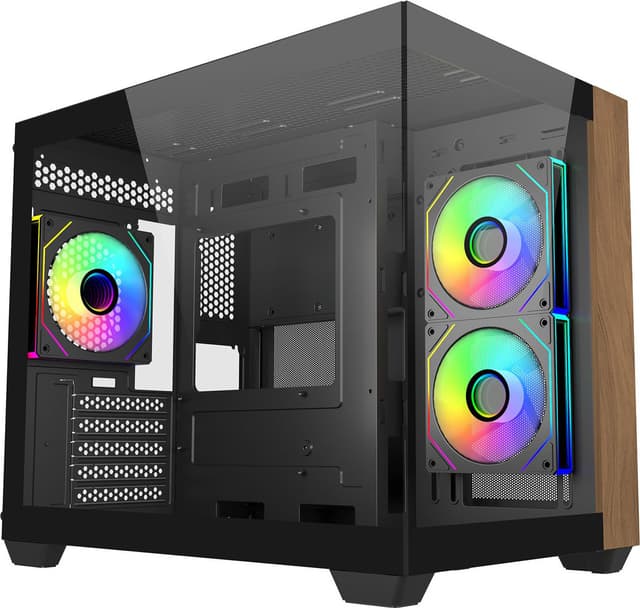 Cooler Master Elite 481 PC-kabinett i tre kombinerer naturlig varme med moderne PC-ytelse. Frontpanelet i ekte tre og klare glasssider skaper et koselig og stilfullt utseende, mens den kompakte to-kamrede utformingen støtter kraftig maskinvare og jevn kjøling. Perfekt for hjemmekontor, studio eller spilloppsett – det bringer både skjønnhet og ytelse til skrivebordet ditt.