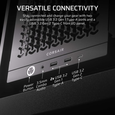 Front I/O-panelet har to USB 3.2 Gen 1 Type-A-porter og en USB 3.2 Gen 2 Type-C-port, som gir enkel tilgang for tilkobling og lading. Panelet er utskiftbart, noe som muliggjør oppgraderinger for å møte dine tilkoblingsbehov.