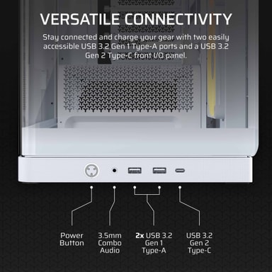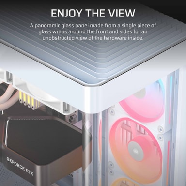 Dette PC-kabinettet har et premium design med et enkelt buet glasspanel som går rundt front og side, og gir en ren, uavbrutt oversikt over bygget ditt. Den moderne eksteriøren bruker myke, flytende linjer for et unikt utseende, mens det modulære FRAME-systemet lar deg tilpasse deler av kabinettet etter behov. Innvendig støtter den romslige layouten store komponenter og inkluderer en justerbar GPU-støttearm for å holde oppsettet ditt stabilt og pent på linje.