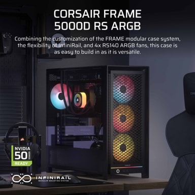 Corsair FRAME 5000D RS ARGB PC kabinett er et romslig mid-tower som støtter eATX-bygg. Det har et frontpanel med høy luftstrøm, fire ARGB-vifter og plass til store 420 mm radiatorer, et solid valg for kraftige, godt avkjølte oppsett.Les mer om produktet