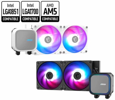 MAG CORELIQUID A13 240 CPU vannkjøler kjøler ned prosessoren din med to 120 mm ARGB-vifter og aluminiumsradiator. PWM-støtte sikrer presis viftekontroll. Kompatibel med AM5, LGA1851 og LGA1700, og er ideell for PC-er med høy ytelseLes mer om produktet