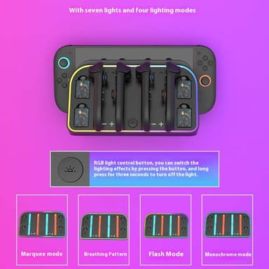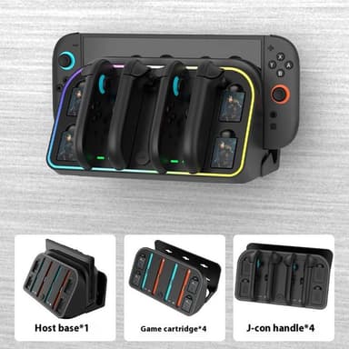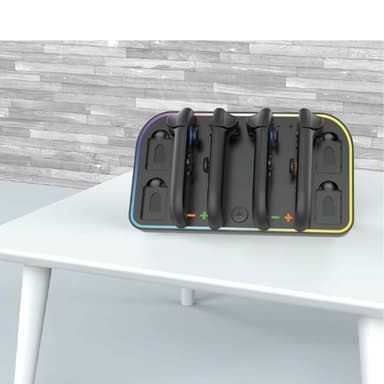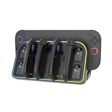 Lading av flere enheter: Lad opptil fire enheter samtidig med de innebygde 5V 200mA-utgangene. Dette ladestativet støtter SWITCH 2-konsollen og flere kontrollere, slik at du alltid er klar for din neste spilløkt. De integrerte USB- og Type-C-portene tilbyr allsidige ladealternativer for ulike enheter. Si farvel til å vente på at enheter skal lades, og nyt uavbrutt spilling med denne effektive ladeløsningen for flere enheter. Stativet administrerer intelligent strømfordeling for optimal ladeytelse.