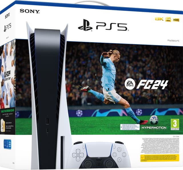 PlayStation 5 + EA SPORTS FC 24 samlepakke inneholder neste generasjons PS5-konsoll med både 4K- og 8K-oppløsning, 120 fps og en nydesignet DualSense-kontroller som gir deg enda bedre haptisk tilbakemelding. I tillegg inneholder pakken en EA SPORTS FC 24-kupong til hele spillet og en kupong til FC 24 Ultimate Team digitalt innhold, slik at du kan begynne å spille med en gang.