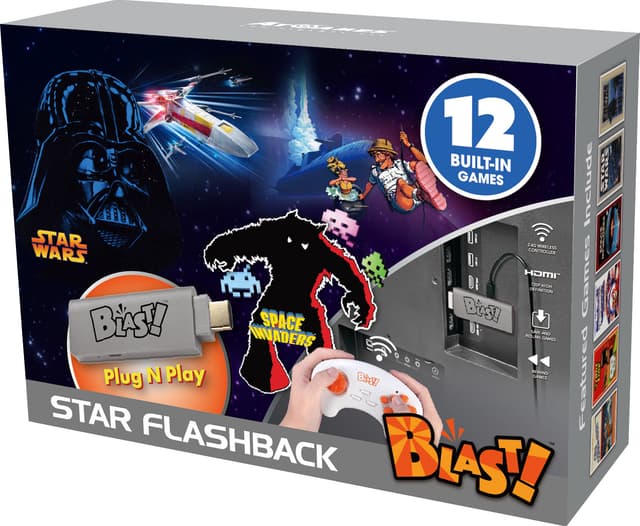 Spillkonsollen AtGames Star Flashback Blast! lar deg spille 12 retroklassikere, inkludert Star Wars, Star Wars: The Empire Strikes Back, Front Line og Jungle Hunt. Konsollen kommer utstyrt med en controller og svært enkel plug-and-play HDMI-tilkobling. Takket være den kompakte størrelsen kan du fint ta konsollen med deg på ferie.