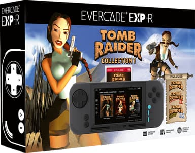 Evercade EXP-R håndholdt spillkonsoll og Tomb Raider Cartridge pakke