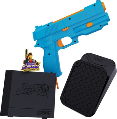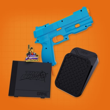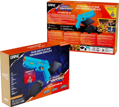 G'AIM'E Premium Pack spillkonsollpakke er en plug-and-play lyspistolkonsoll som bringer arkadeskytespill til moderne TV-er. Den bruker AI med innebygd kamera for skjermgjenkjenning og presisjon, inkluderer en lyspistol, pedal og 4 klassiske spill.Les mer om produktet