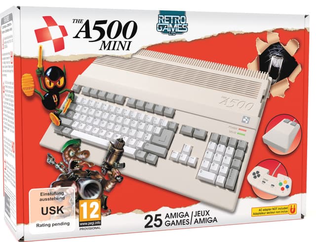 Retro Games Ltd The A500 Mini retro spillkonsoll bringer tilbake de gode gamle dagene. Hopp inn i barndomsminnene med de 25 inkluderte spillene som Worms og Simon the Sorcerer. Konsollen kommer med en autentisk mus og kontroller, begge med Bluetooth-tilkobling, konsollen kobles til med HDMI. For flere spill kan du bruke en USB-minnepenn, og viktigst av alt, du kan lagre fremgangen din når som helst.
