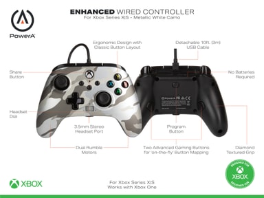 PowerA Enhanced Wired kontroller til Xbox Series X|S kommer utstyrt med alt du trenger for jevnt gameplay når du spiller dine eksklusive Xbox Series X-spill. Denne offisielt lisensierte kontrolleren kommer med to programmerbare knapper som du enkelt kan tilpasse midt i spillingen. Den kommer også med to vibrasjonsmotorer og flott ergonomi som gjør at kontrolleren passer godt i hendene dine. Antifriksjonsringene sørger for at du ikke glipper kontrolleren under nøkkeløyeblikkene i dine intense matcher, mens de presisjonsjusterte analoge spakene lar deg slippe løs fryktinngytende komboer. Du kan også enkelt koble til stereoheadsettet ditt via 3,5 mm-utgangen.