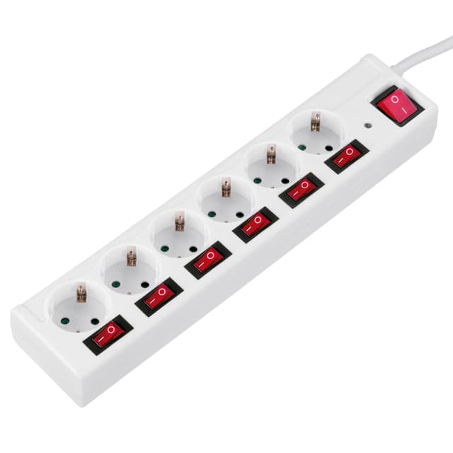 Hama 6-veis grenuttak med beskyttelse mot overspenning og individuelle strømbrytere for hvert uttak.