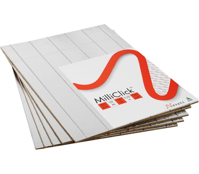 bruksområder: millicable er en lavtbyggende toleder varmekabel levert på snelle, som enten kan støpes inn eller inngå sammen med milliclick plater og danne et eget gulvvarmesystem. Kabelen leveres med fabrikkmontert endeavslutning og skjøt mellom varmeelement og kald tilleder (3,5 m). Ved frilagt installasjon festes kabelen til underlaget med lim eller punktvis med aluminiums tape. Avstand mellom kabelstrenger (c- c avstand) beregnes på forhånd. Deretter støpes kabelen inn. Sammen med milliclick er millicable beregnet for tregulv og installasjon uten støpemasse. Kabelen har metereffekt 6 w/m og presses ned i spor i platene som har c- c avstand 10 cm. Dermed med blir fl at effekten ved forlegning i milliclick plater lik 60 w/m2. Konstruksjon: varme leder: entrådet motstandslegering (tur og retur i kabel) kald tilleder: entrådet glødet kobber isolasjon: fep jordleder: entrådet, glødet kobber kombinert skjerm og ytre kappe av ledende polymer. Tykkelse: 4 mm tekniske data: elementeffekt: fra 120 w til 1170 w motstandstoleranse: - 5 /+10 % nom. Driftsspenning: 230 v maks temperatur ytre kappe, spenningsatt: 65 °c lengde kald tilleder: 3,5 m
