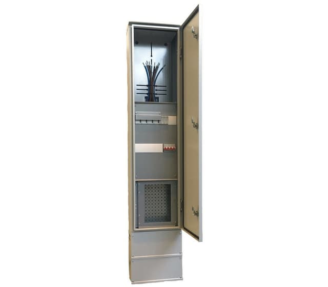 Felles tilknytningsskap i varmgalvanisert stål for sterkstrøm med målerplass og E-com. Beregnet for utvendig plassering. Ferdig koblet TKS Skap smal type.Les mer om produktet
