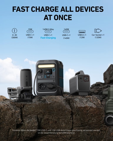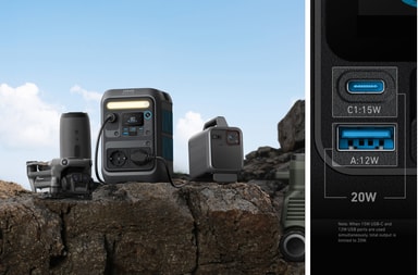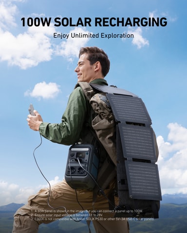 Anker Solix C300X kraftstasjon B1723311 gir 300 W overspenningseffekt, 140 W 2-veis hurtiglading og har 2 AC230V- og 1 DC12V-uttak. Den leveres med et 60 W solcellepanel som gir strøm på selv fjerne steder, ideell for camping og reiser.Les mer om produktet
