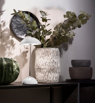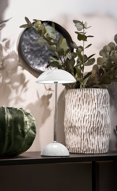 Aura oppladbar bordlampe EL206258042 har berøringskontroll og trinnløs dimmer. Den lades på 3 timer og varer i 4-6 timer. Med et lys på 100 lumen er den ideell til innendørs bruk som dekorativ gjenstand eller til lesing.Les mer om produktet