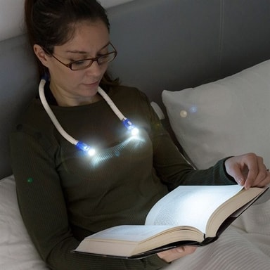 "Fleksibel nakkelampe med fire kraftige LED dioder som kan tennes individuelt eller sammen avhengig av hva du vil belyse og hvor sterkt lys du vil ha. Du henger lampen rundt nakken og retter de bøyelige armene for å få en behagelig belysning med hendene helt fri. Perfekt når du vil lese i sengen, på fly eller tog uten å forstyrre noen annen eller som arbeidslampe ved reparasjoner- og håndarbeid når du trenger å ha begge hendene fri.