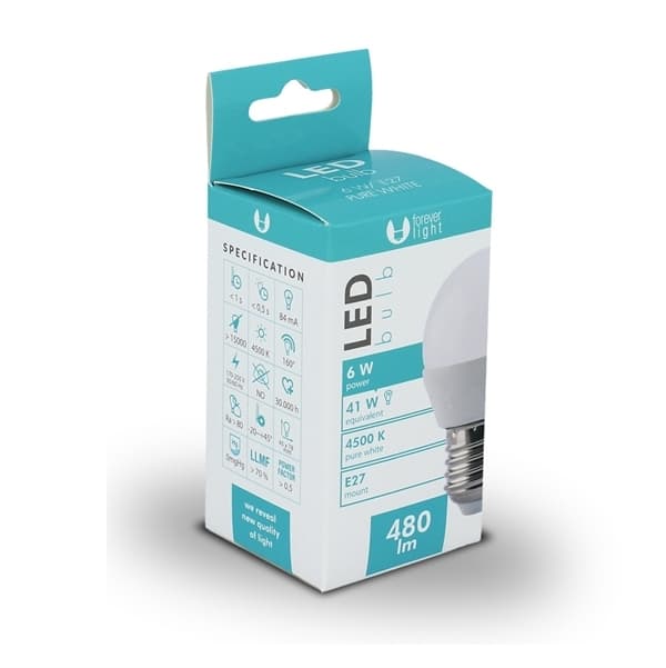 LED lyspære E27 Farge: Hvit Sertifikat: CE Lumen: 480 lm Tilsvarer en gammel lyspære: 41 W Strømforbruk: 6 W Livslengde: 30 000 timer Fargetemperatur: 4 500 K Tone: Kald hvit IP20