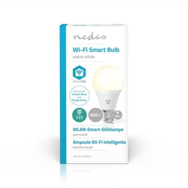 Ta kontroll over din belysning med dette sett på tre smarte lyspærer som kobles direkte til din trådløse/Wi-Fi-router for å tilby fjernstyring som en del av ditt automasjonssystem for hjemmet. Enkel innstallasjon Du må ikke være et teknisk geni eller elektriker for å styre og automatisere din belysning på distanse. Alt du trenger er din Wi-Fi-router, vår intuitive app og Nedis® trådløse smarte lyspærer. Ikke noe ekstra tilbehør eller koblingshubb - dette er hjemmeautomasjon, helt enkelt. Kontroller lyspærens lysstyrke og farge. Koble dem for å styre lysstyrken og forandre belysningen fra din smartphone eller nettbrett. Og om du blir supersmart kan du også styre dem med din stemme via Amazon Alexa eller Google Home. Still inn sckjema og pare sammen med andre smarte produkter. Still inn sckjema for når lyset skal tennes eller skape stemningsscener på et øyeblikk ved å pare sammen denne lyspæren med andre produkter fra Nedis® SmartLifeTM-serien. Miljøvennlig Ditt hjem blir ikke bare smartere, det blir også miljøvennligere. Disse energieffektive lyspærer har et maksimal strømforbruk på 9 W, men de gir en effekt på rundt 800 lumen, noe som er samme som de fleste 60 W-pærer. Om Nedis SmartLife Oppdag et stort og stadig voksende sortiment av produkter - som lyspærer, brytere, kontakter, sensorer og kamera - som alle kan styres med en brukervennlig og intuitiv app. Med stemmestyringfunksjoner som støttes av Amazon Alexa og Google Home og uten behov av noe annet enn ditt befintlige Wi-Fi-nettverk er dette et koblet, smart hjem på en enkel måte. Uansett om du leter etter en eneste smart lyspære eller et uttak, eller om du vil automatisere hele huset, kan du oppdage hvor lettilgjengelig smart teknikk er i dag. - Automatisere dine lyspærer enkelt og smidig - kobles direkte til din Wi-Fi-router - Forandre lysstyrken og fargen på lyspærene på avstand - via din smartphone eller nettbrett - Skjemalegg din lampe når den skal tennes - eller skap stemningsscener ved å koordinere den med andre Nedis® SmartLife-produkter - Støtte for stemmestyring - via Amazon Alexa eller Google Home - Livslengde: 25000 timer - 9W som tilsvarer 60W